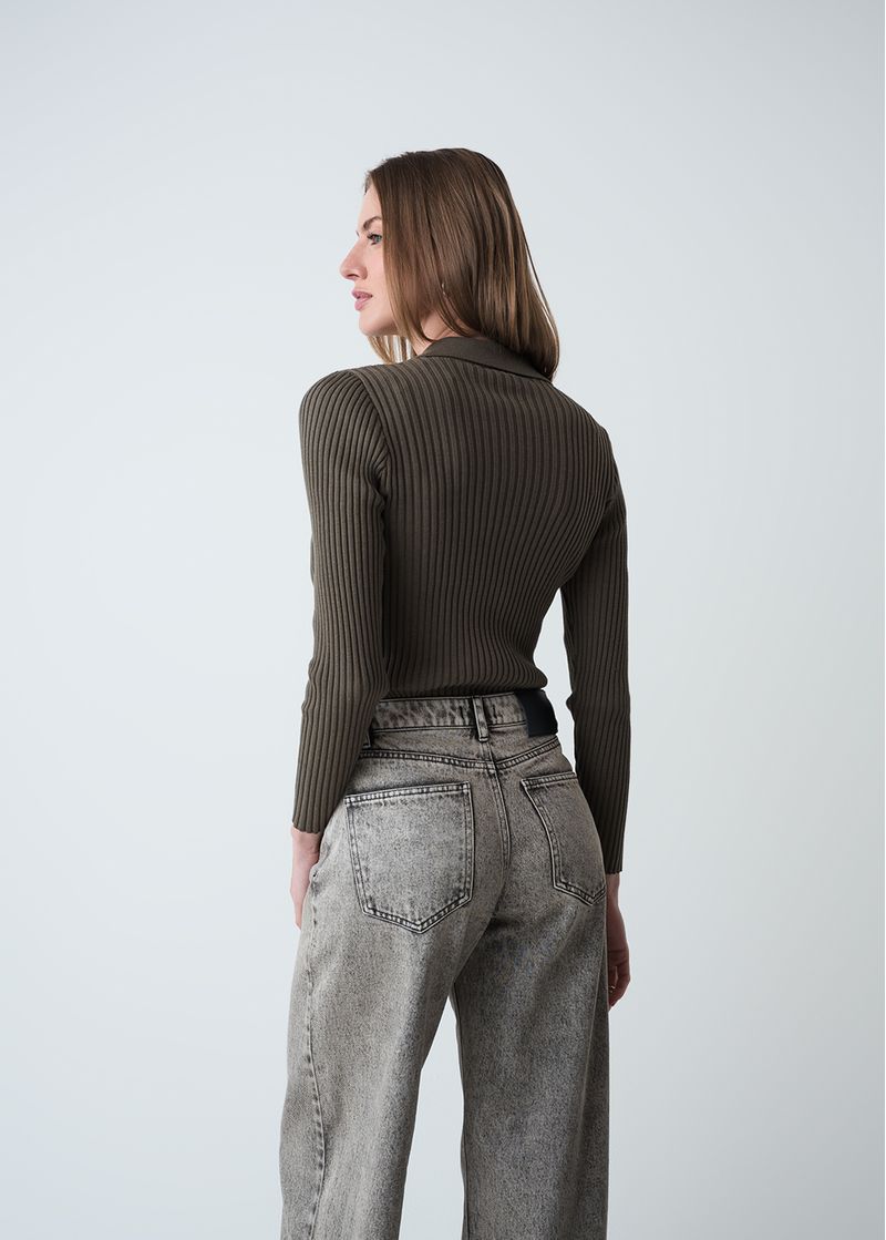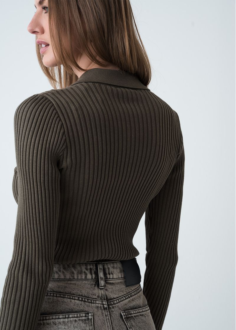 • Cuello clásico en V con botones.